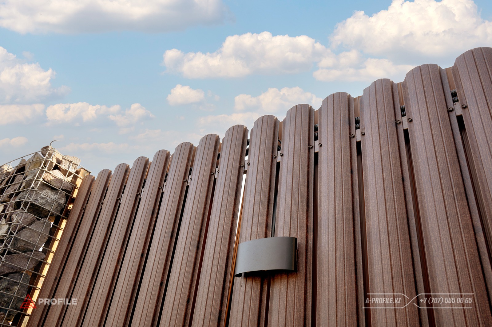 Мы используем только качественную оцинкованную сталь с полимерным покрытием (глянец, матовый, текстура дерева). У нас можно заказать материалы любой нужной высоты. Особой популярностью пользуется евроштакетник двухсторонний — при монтаже в шахматном порядке (шахматка) он полностью скрывает участок от посторонних глаз с улицы, но пропускает свет и не создает парникового эффекта для растений.